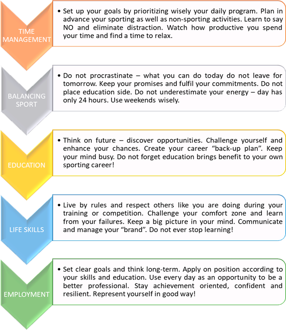 Combining sport with education or work has become increasingly challenging for athletes. Therefore, FIAS Athletes Commission decided to create a short guideline which should advise SAMBO athletes with their transition from sporting career into the business world. The guidelines are based on five milestones TIME MANAGEMENT, BALANCING SPORT, EDUCATION, LIFE SKILLS, EMPLOYMENT and should demonstrate the right path of success in athlete future. SAMBO is pure amateur sport which gives to an athlete moral values instead of financial one. Hence, FIAS is trying to keep the elite athlete involve in our sport by organizing seminars and workshop for them during its main sport events.
