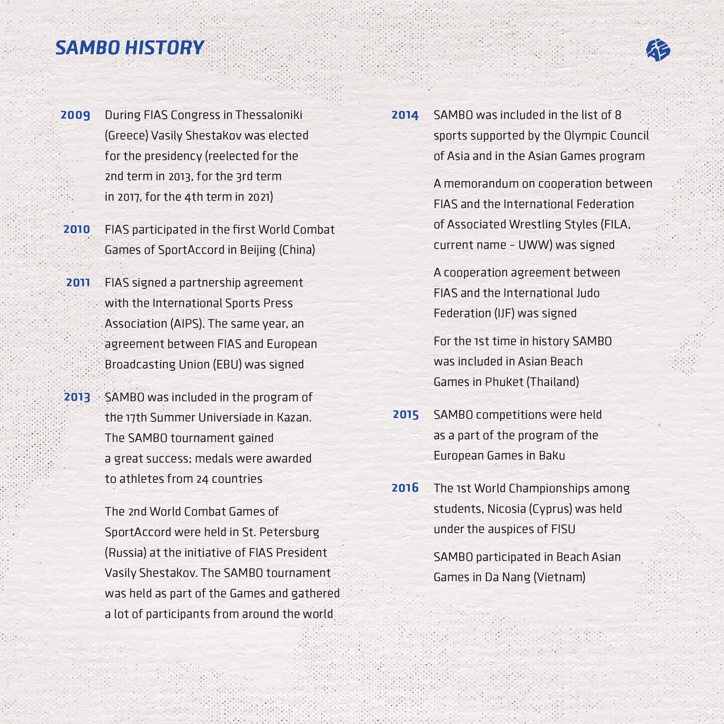 During the whole period of its existence, the FIAS conducts serious work, thanks to which Sambo fans have appeared in more than 100 countries on all continents of the planet. New sections and clubs get open and national Sambo championships are hold in different countries every year.